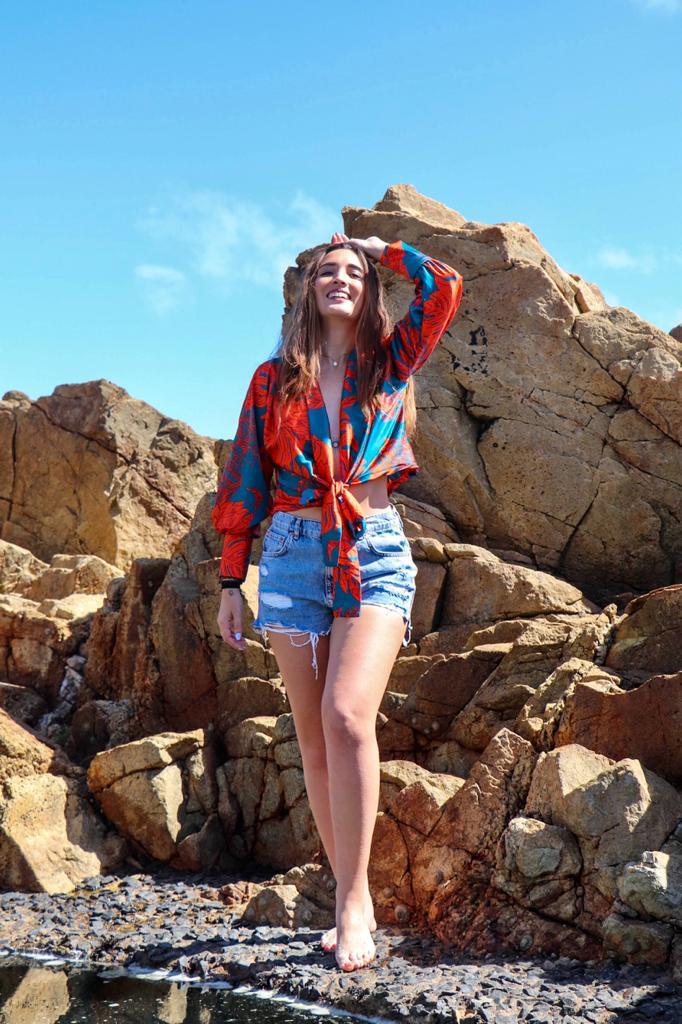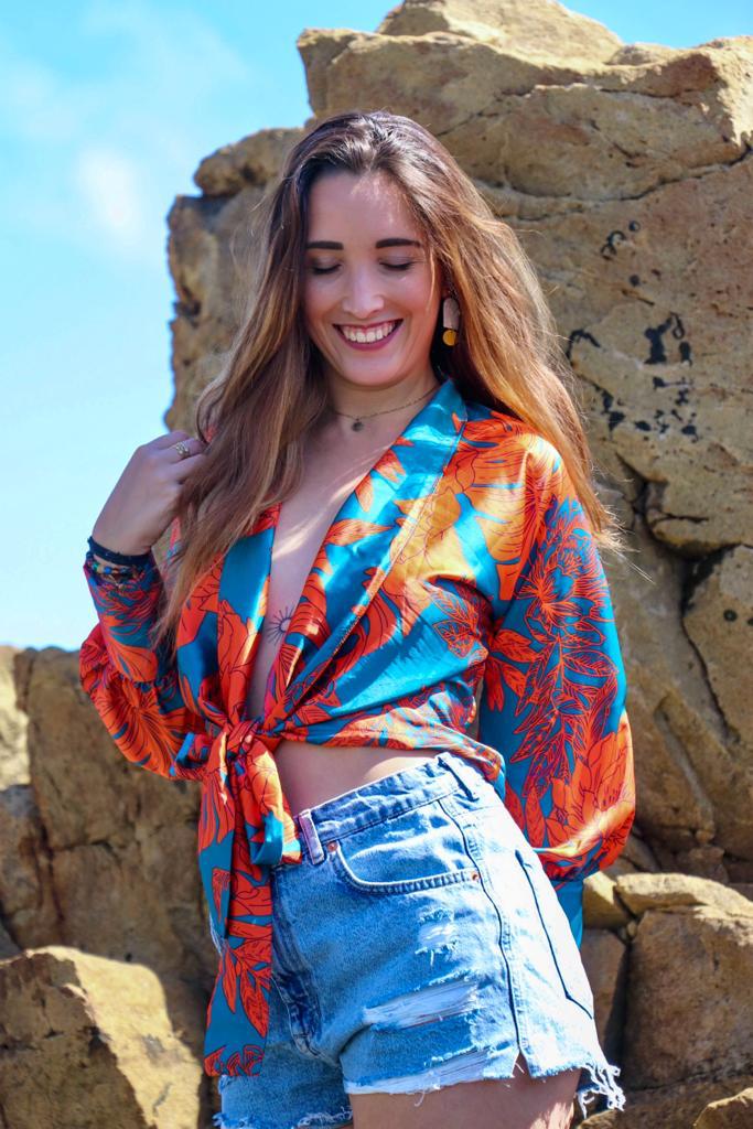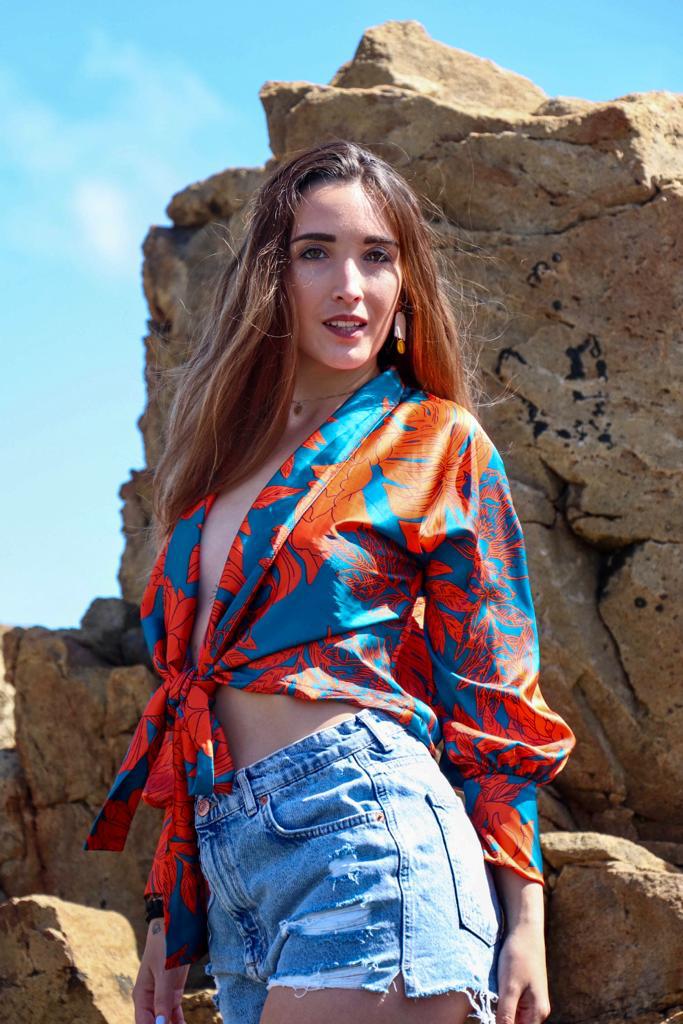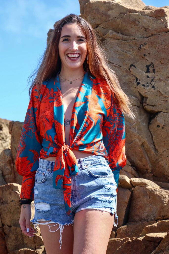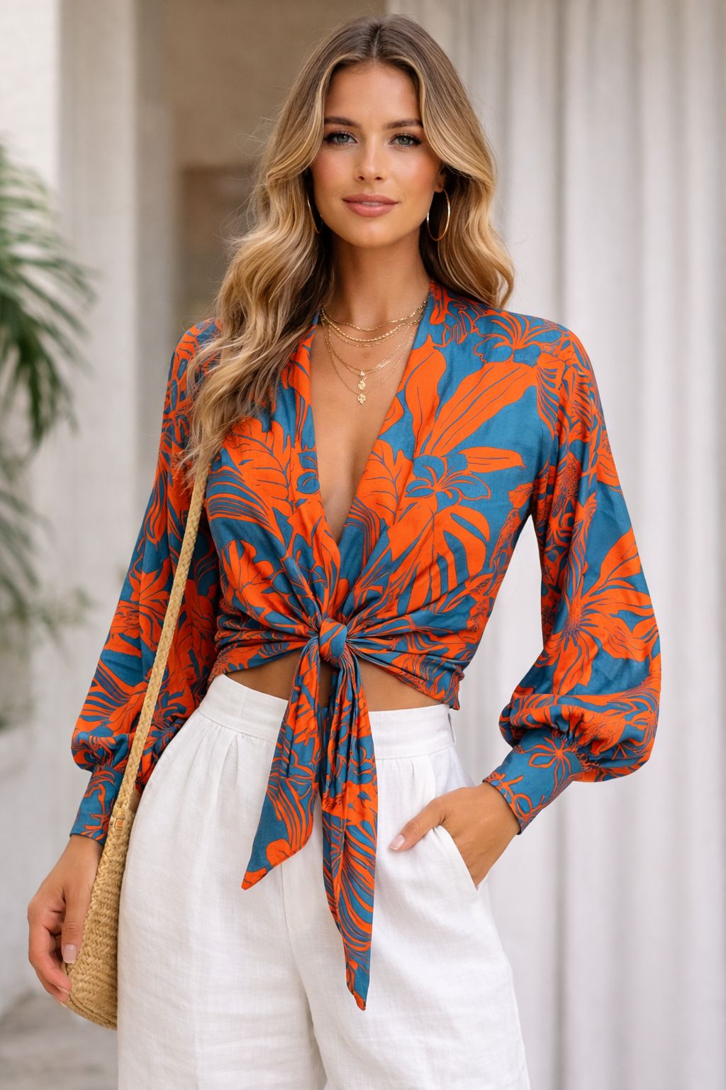 A bold statement piece designed for effortless styling. This wrap top features a flattering silhouette with balloon sleeves finished with a fitted long cuff, creating a soft yet structured look. Crafted in a vibrant print, it ties at the front and can be styled four different ways to suit your mood—wear it cropped, wrapped, knotted, or draped for a more relaxed fit.