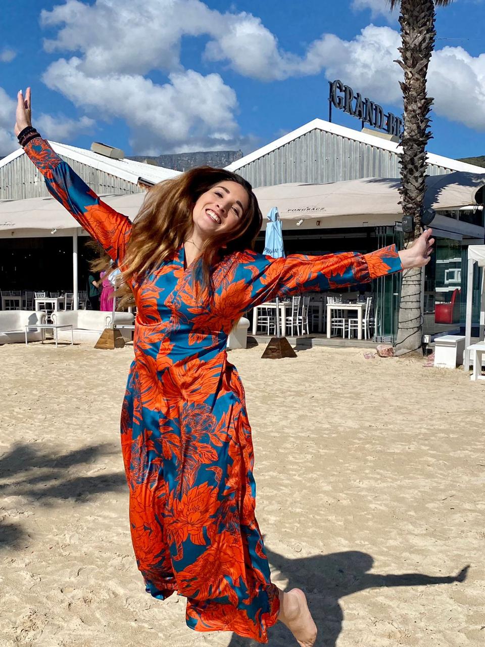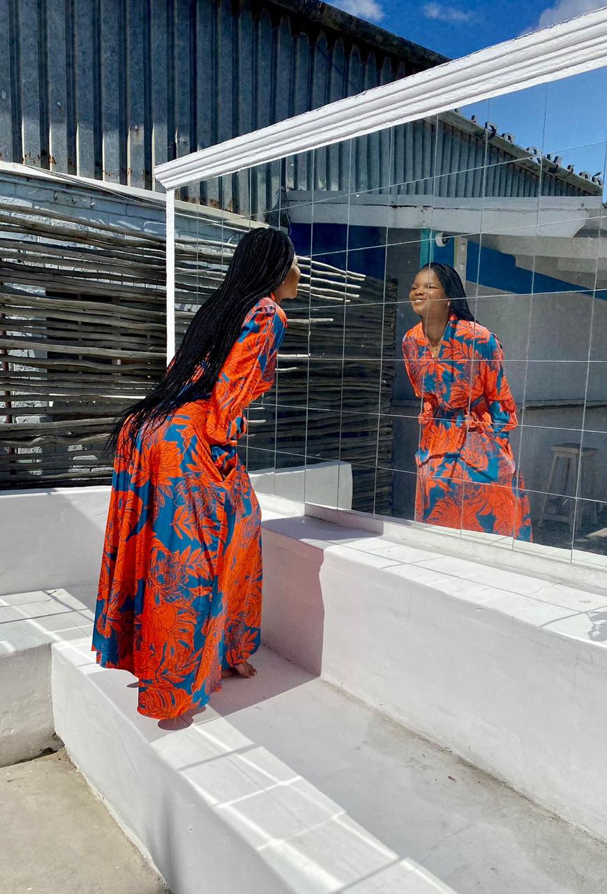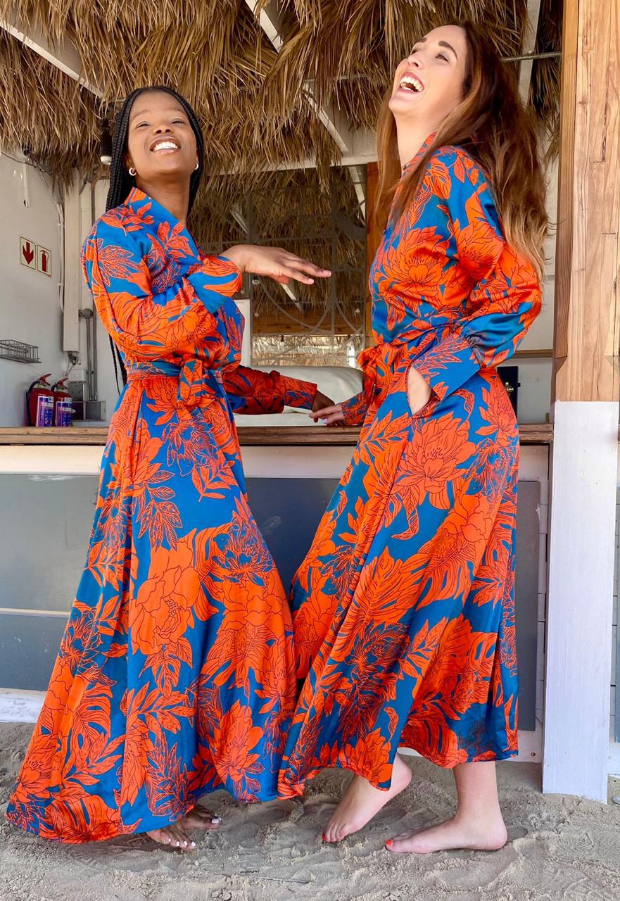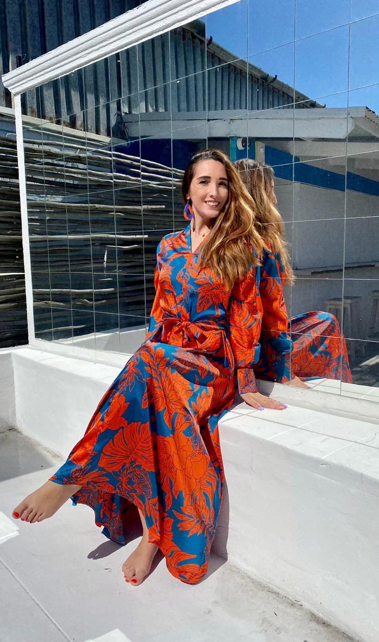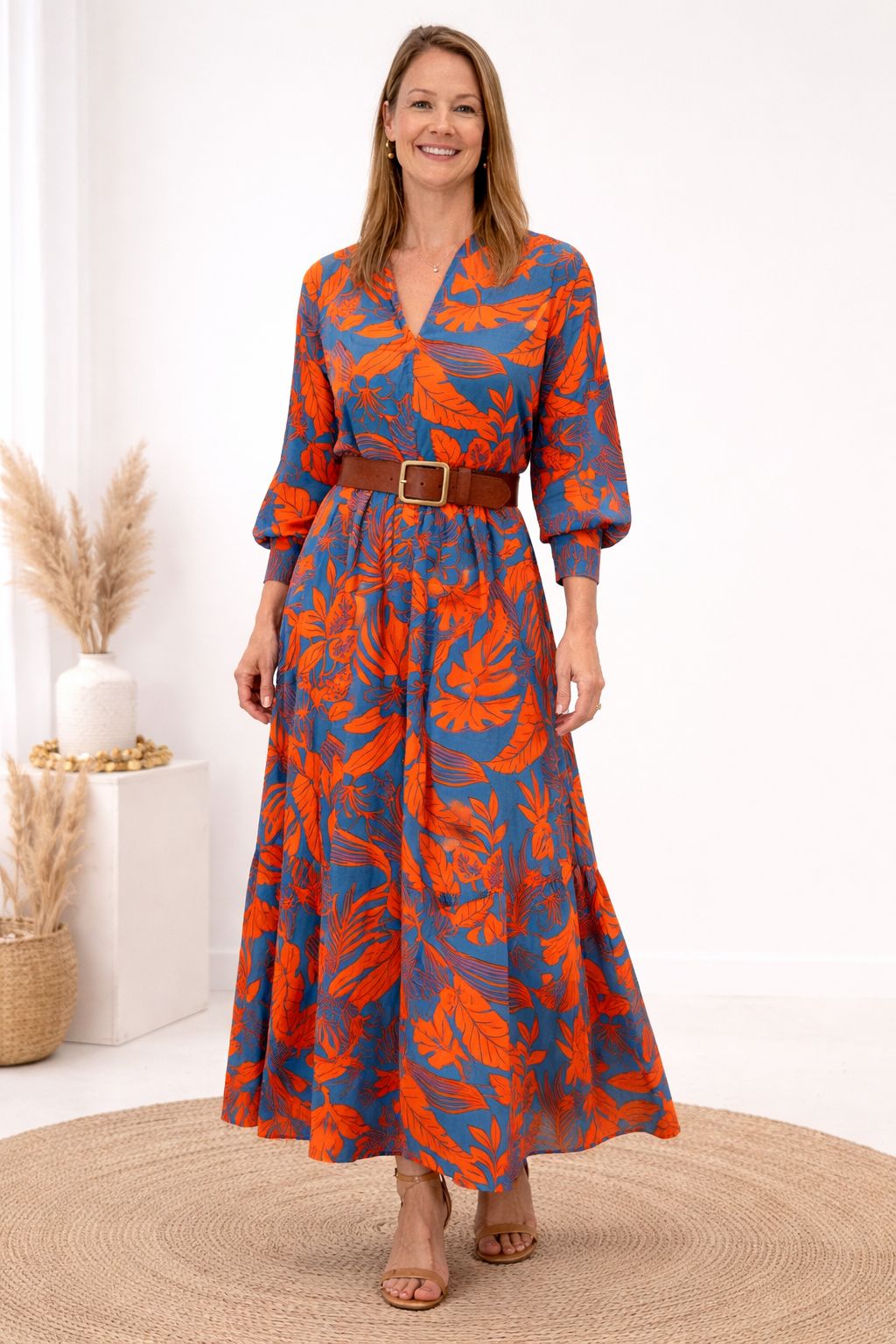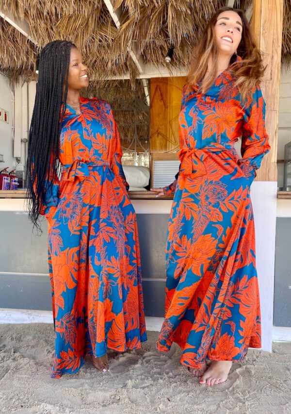 A timeless silhouette brought to life in a bold tropical print. This maxi dress features a flattering V-neckline, softly defined waist, and elegant balloon sleeves finished with fitted cuffs for a refined shape. The flowing skirt moves beautifully with the body, making it an easy choice for both day and evening wear.