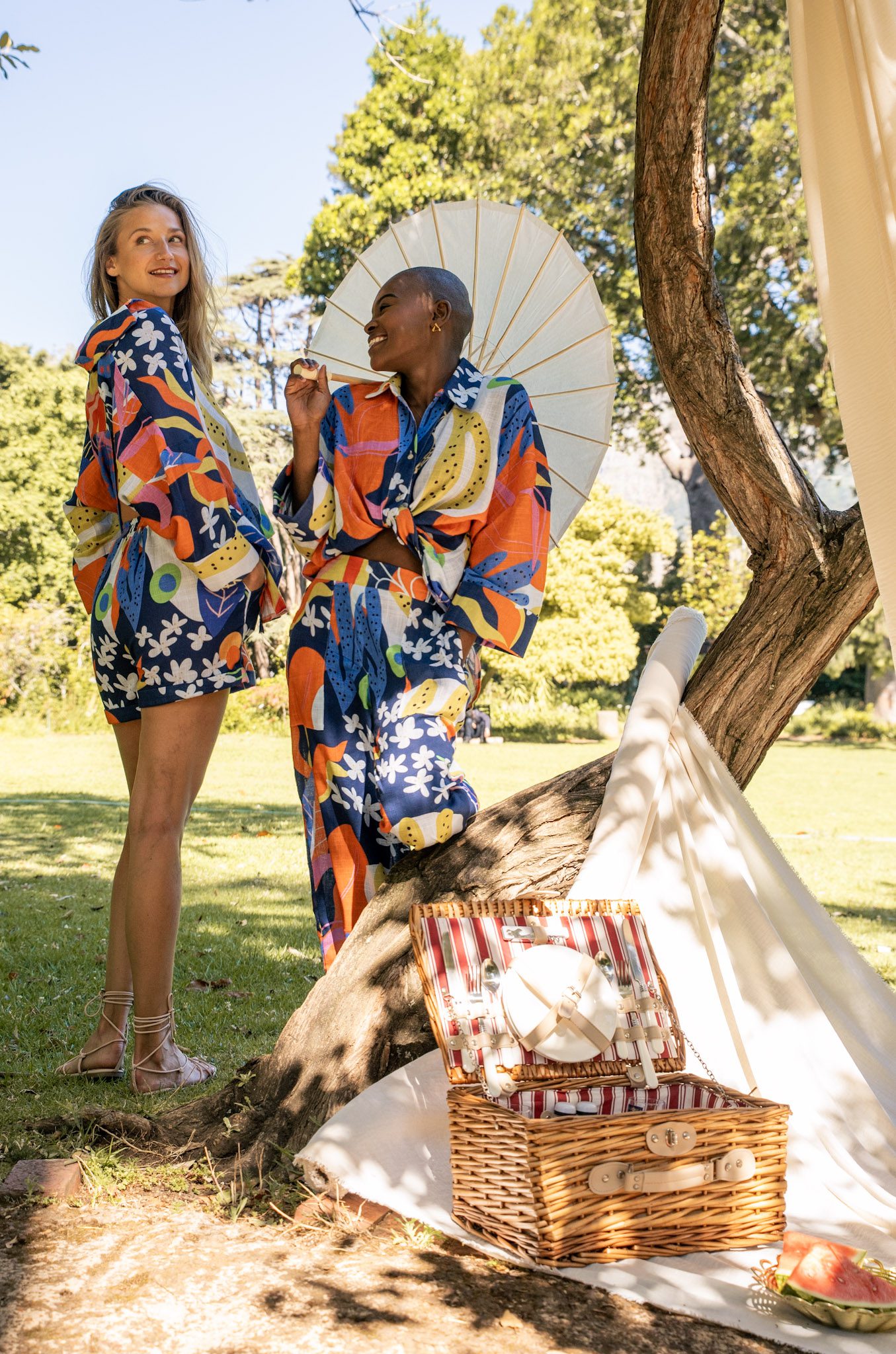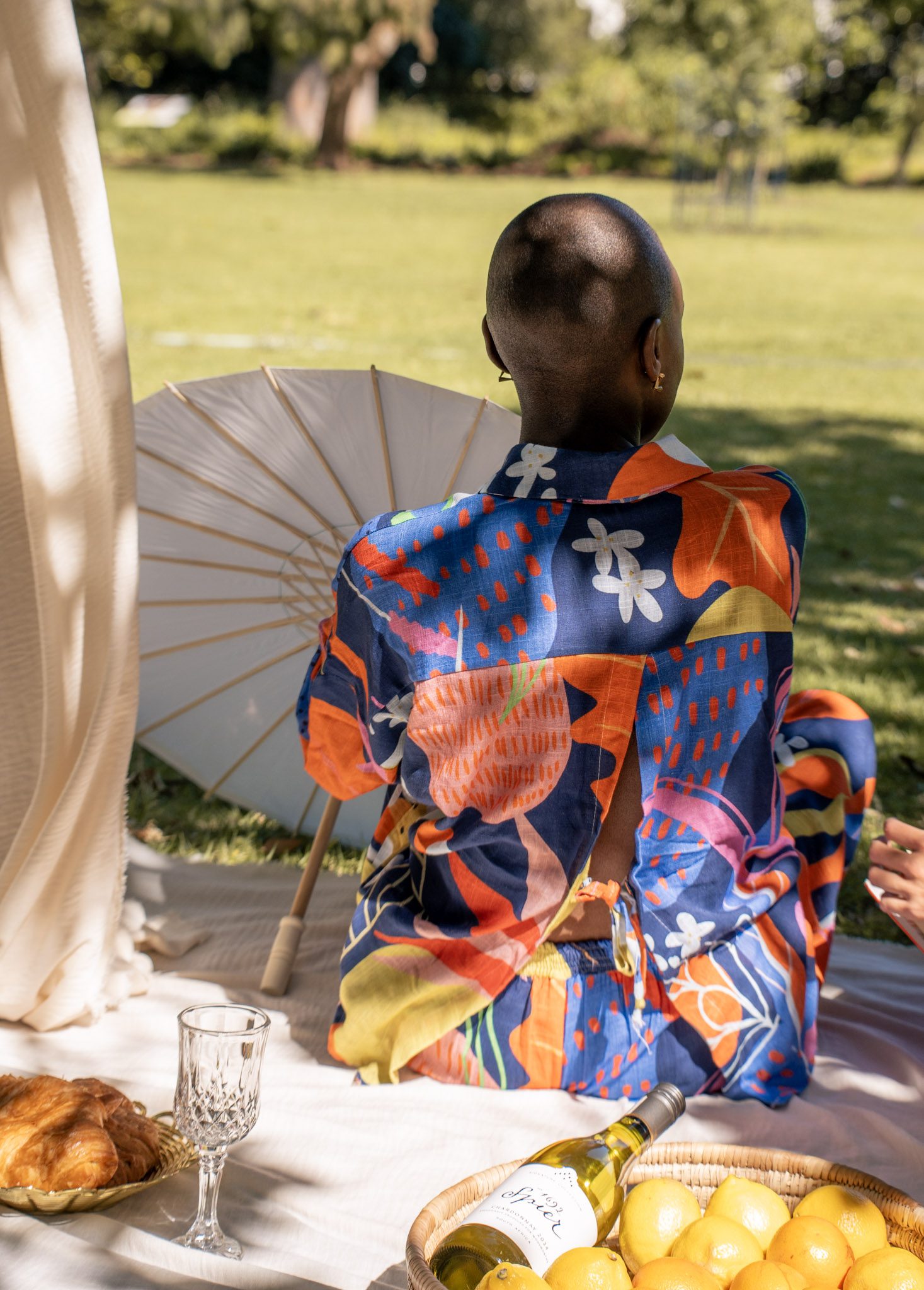 A relaxed-fit button-down with a statement open-back detail that adds a modern, playful twist. Featuring long sleeves and a bold artistic print, it’s perfect for warm days or layered looks.